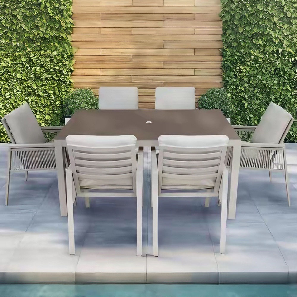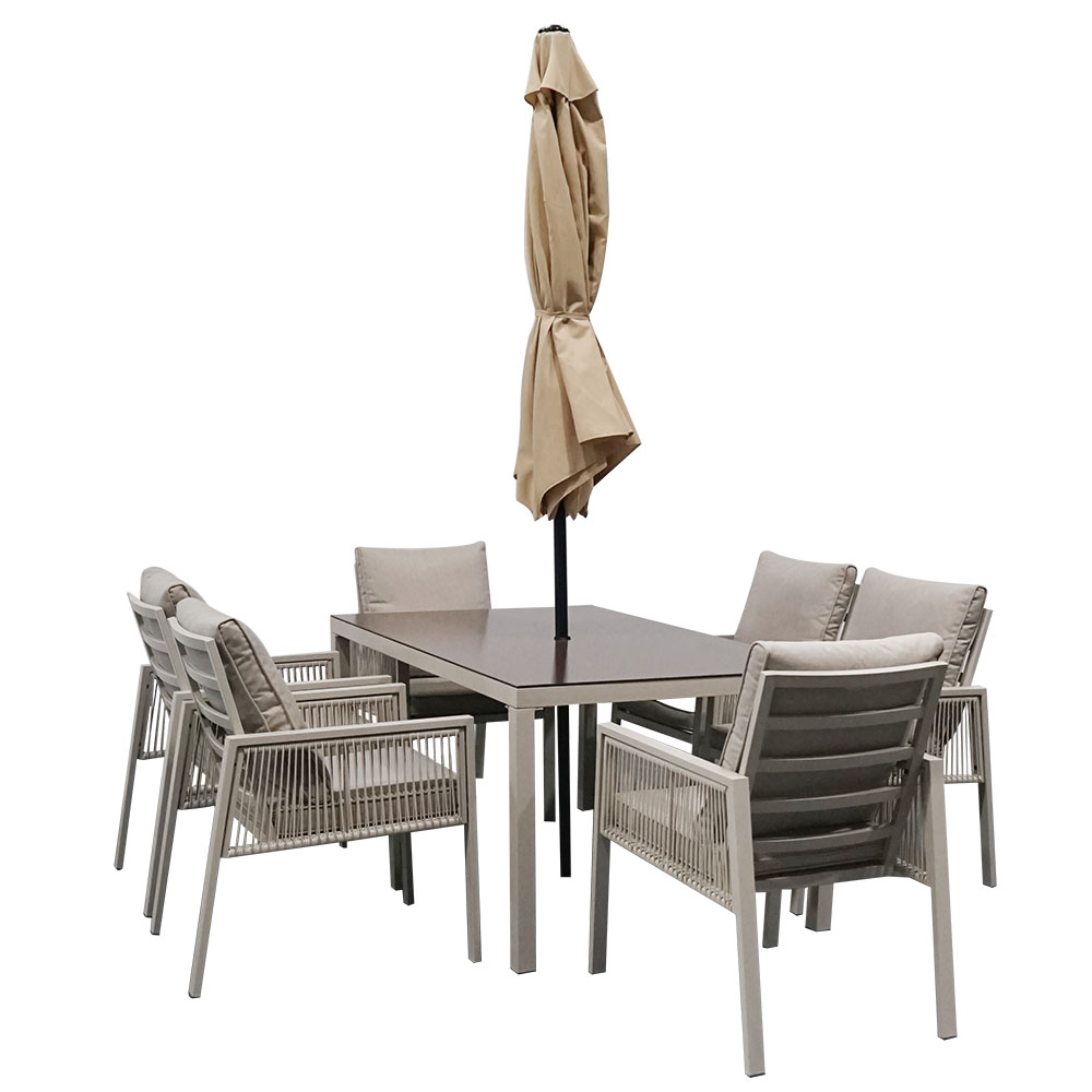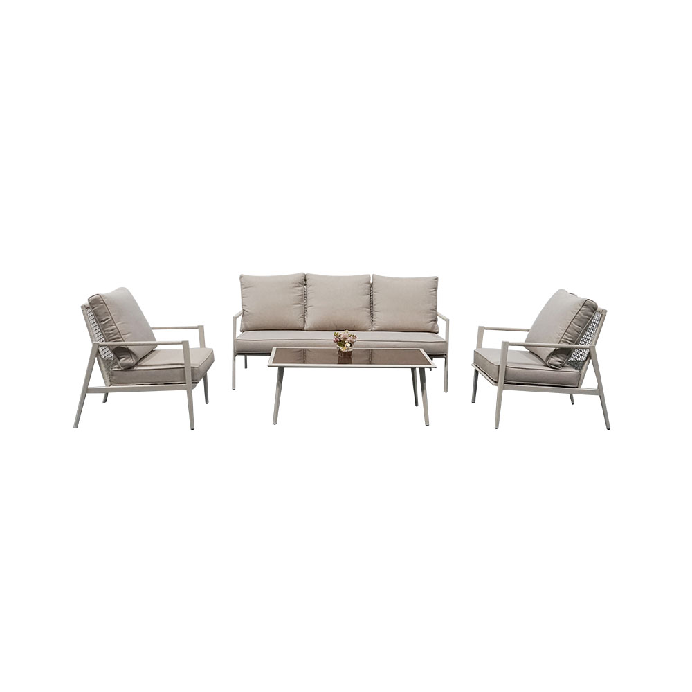 KD Steel Frame, 220g Spunpoly Fabric, 8cm Cushion With Foam, 5mm Tempered Glass On Table, Armrest With Wicker Weaven