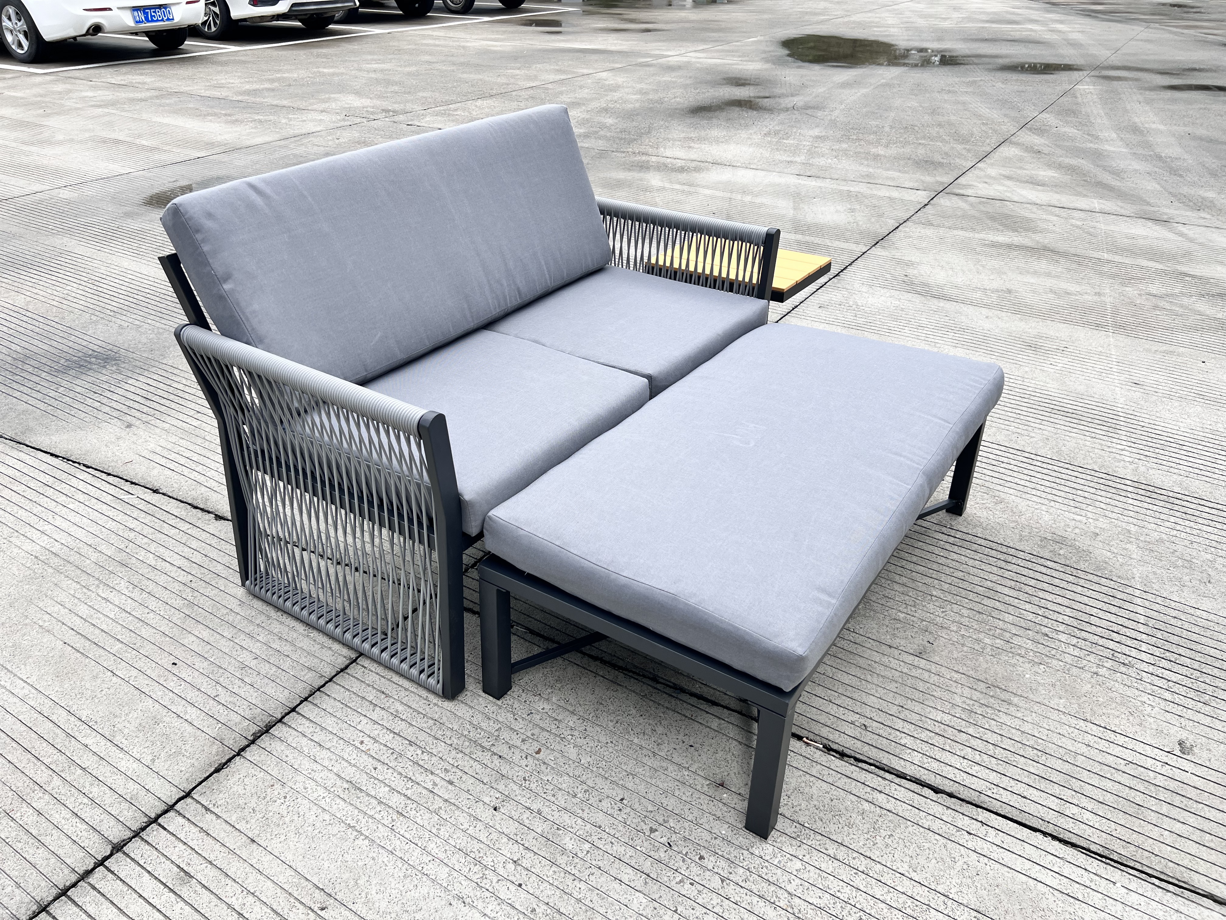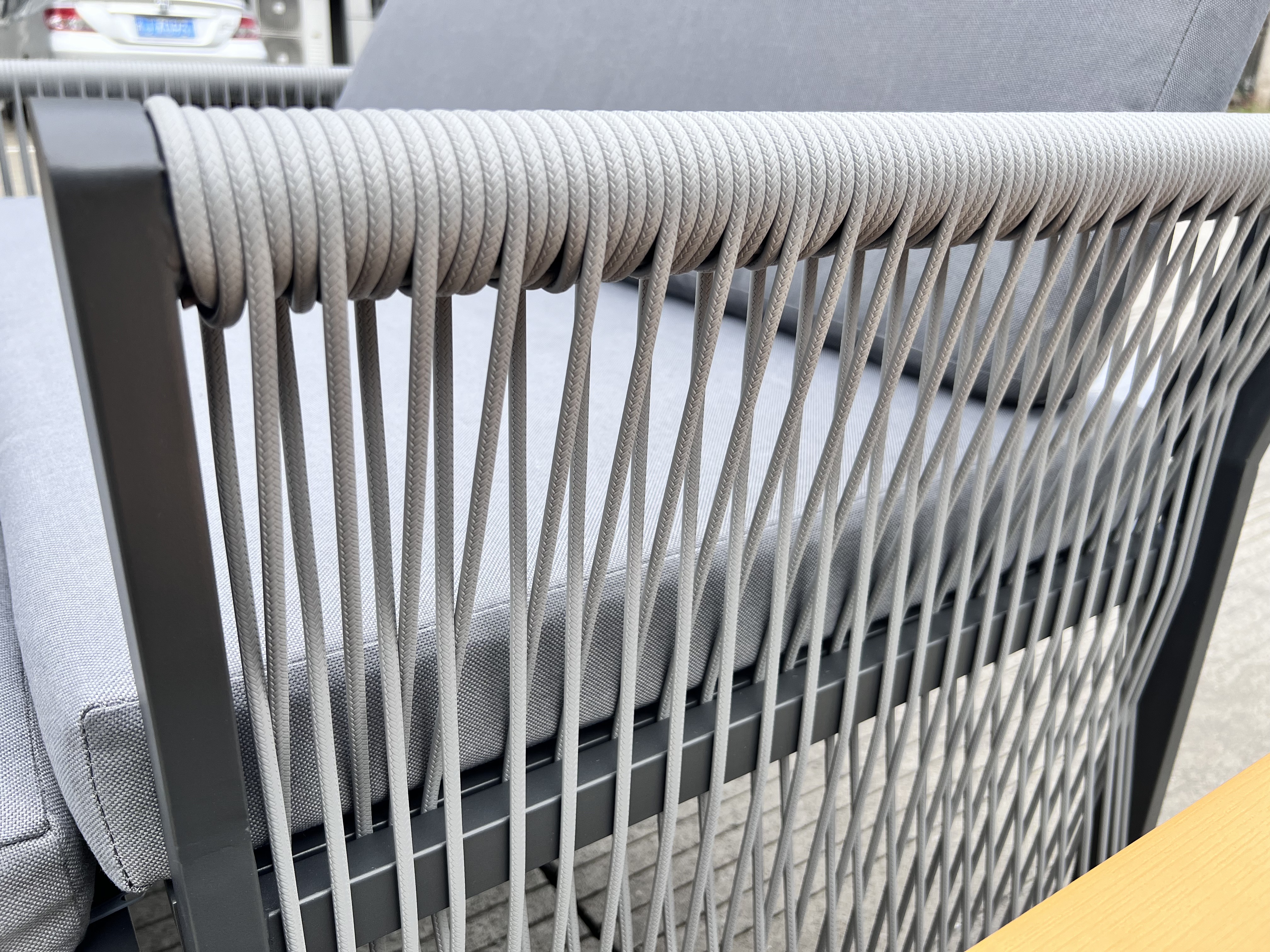 KD Steel Frame, 8cm Cushion,220g Spunpoly, Table Top With Polywood,Armrest With Rope Wicker Weaven