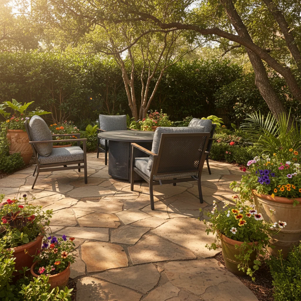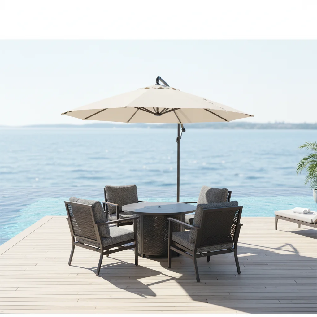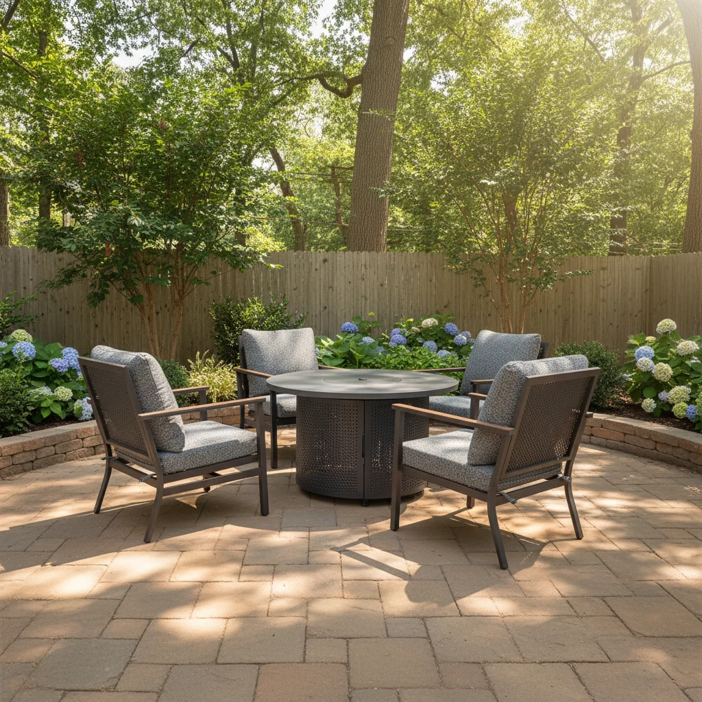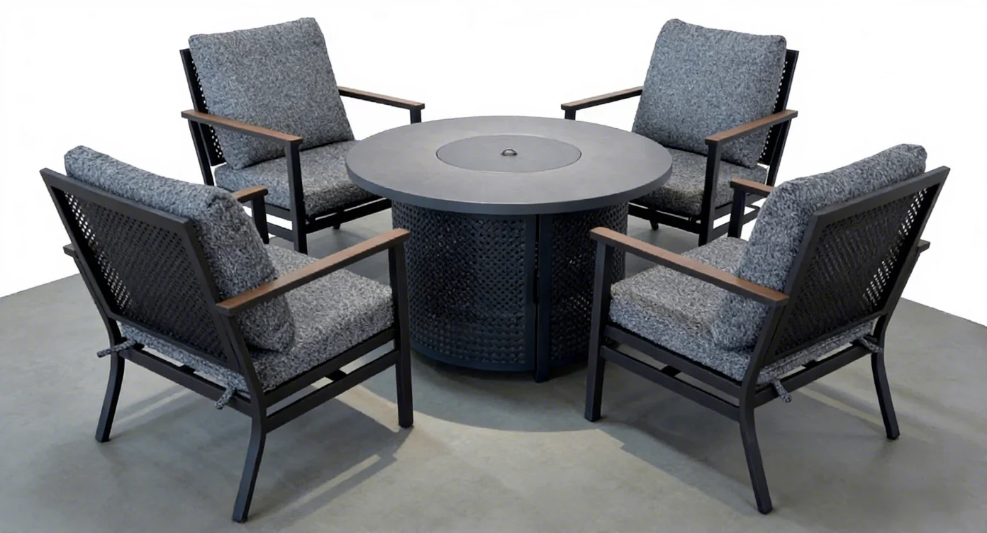 Modern Black Metal 4-Seater Outdoor Fire Pit Dining Set Wood-Accent Armrests & Plush Gray Cushions, Perfect for Patio Gatherings