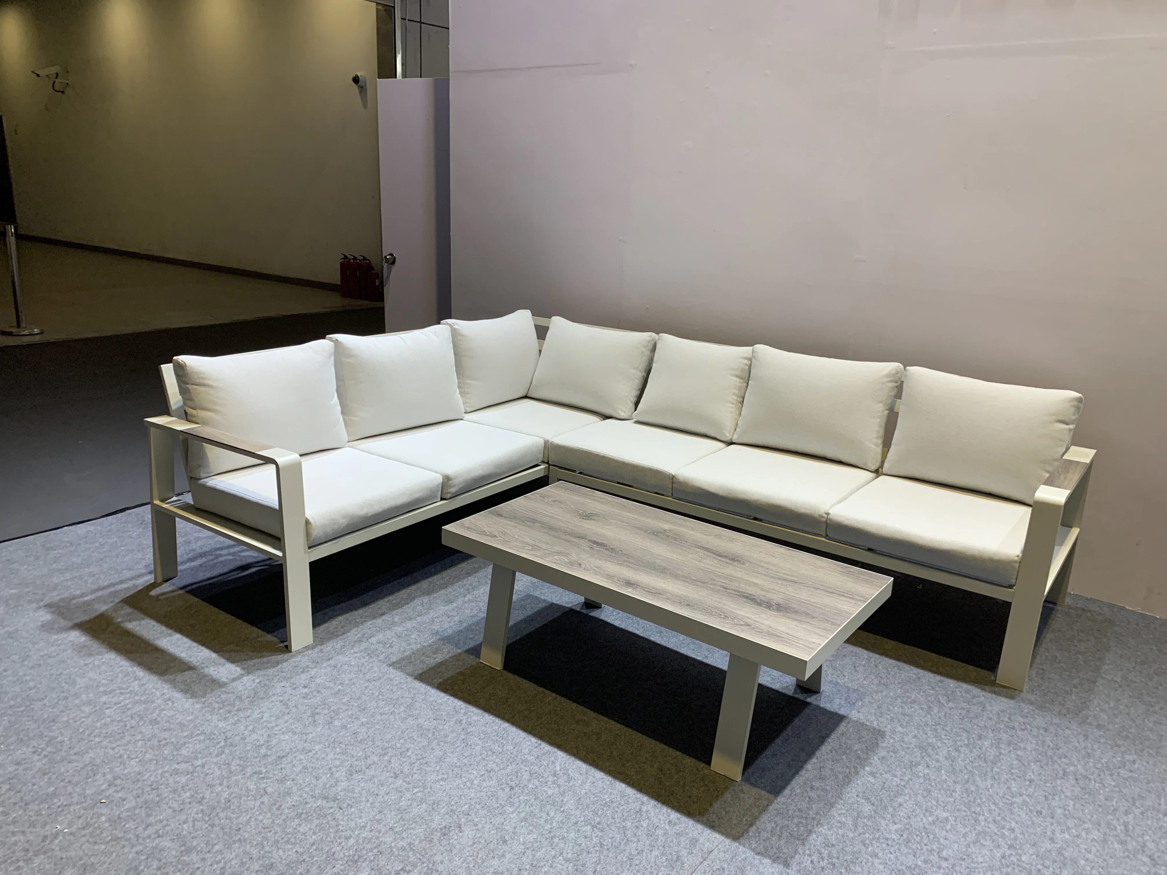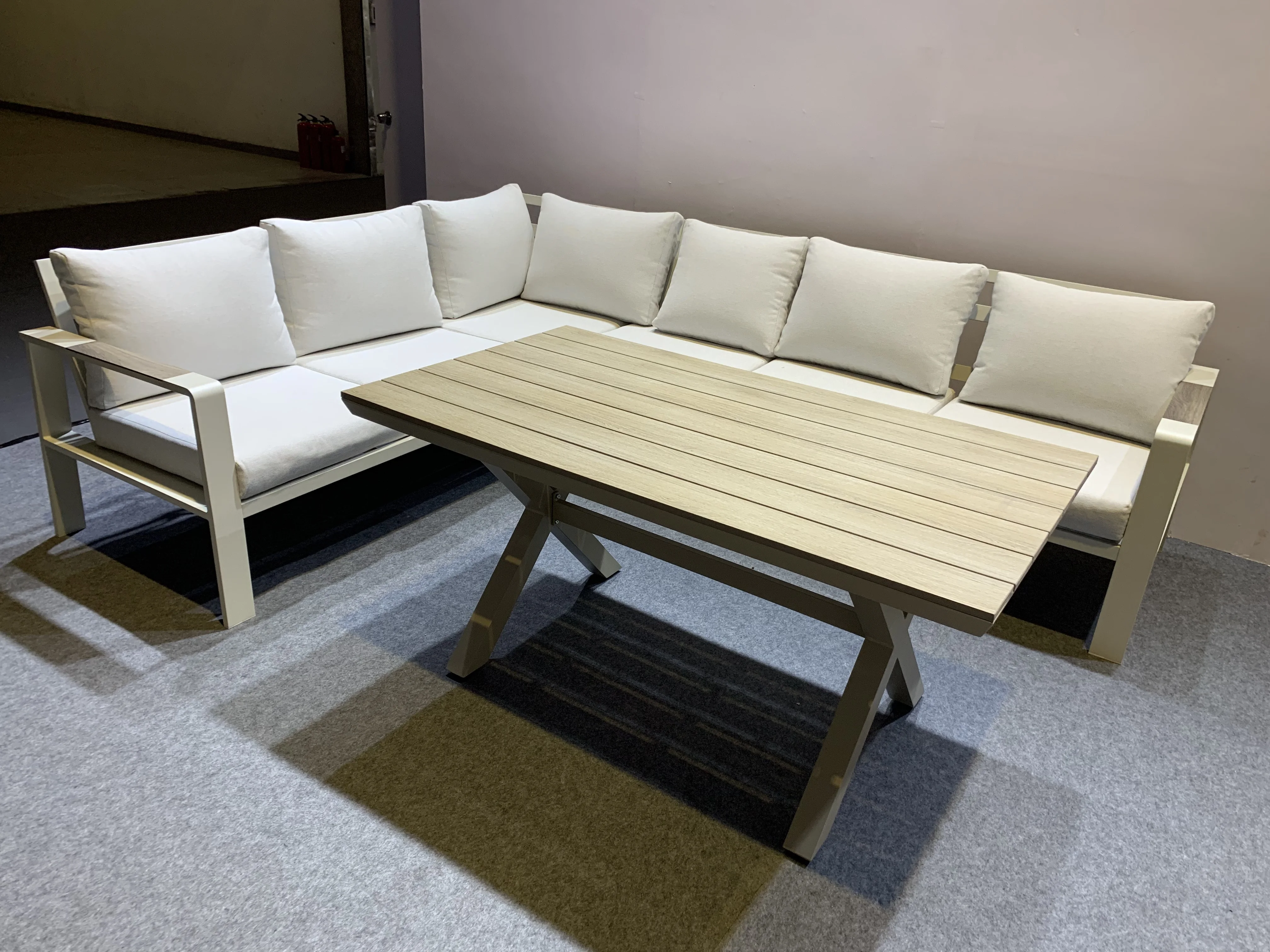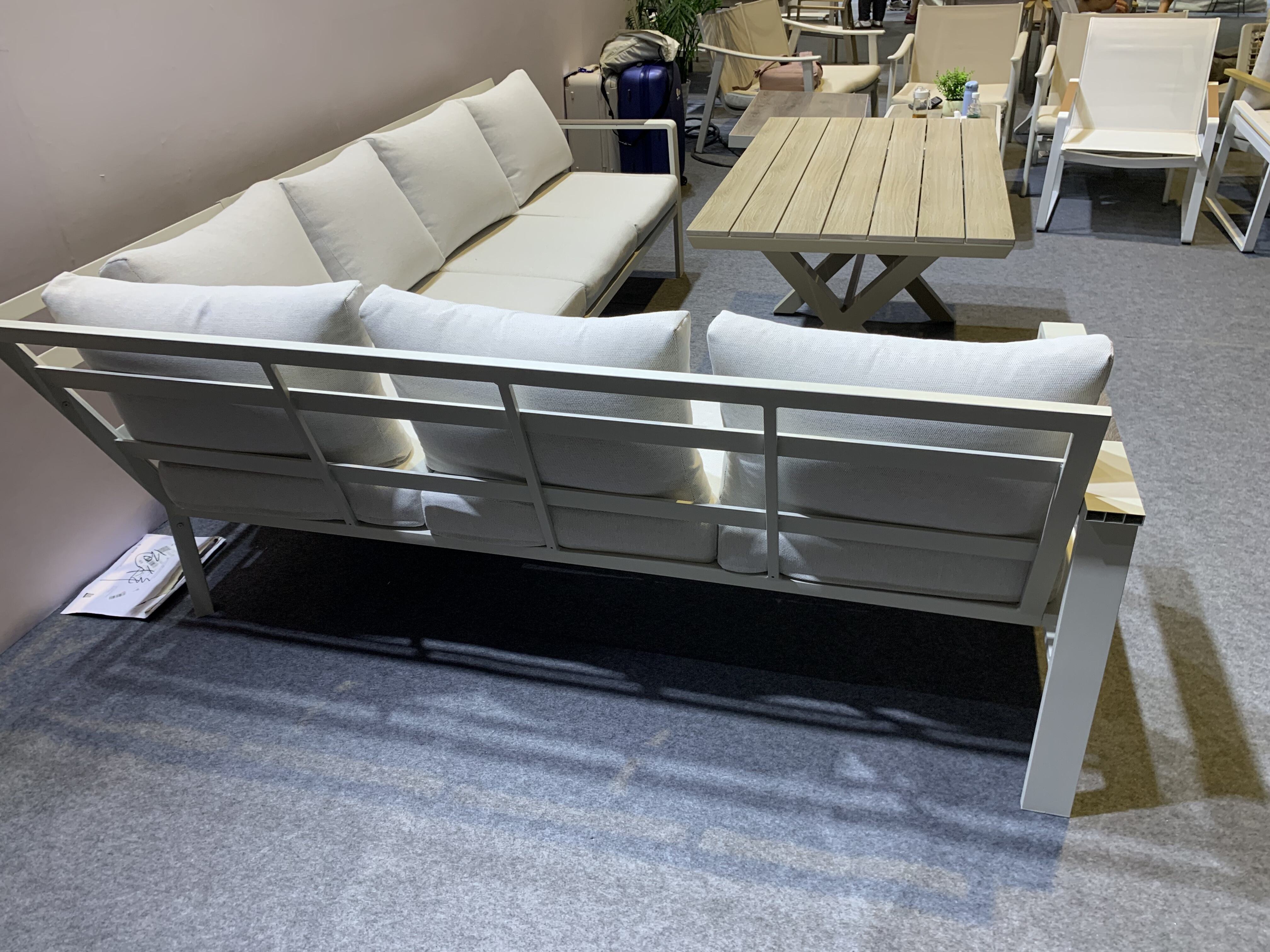 Увођење Алуминијумског угловног софе са светлим - Хјуед јастуцима и пластичним дрвеним столом, савршен додатак вашој спољној тераси за крајњи опуштај и удобност
