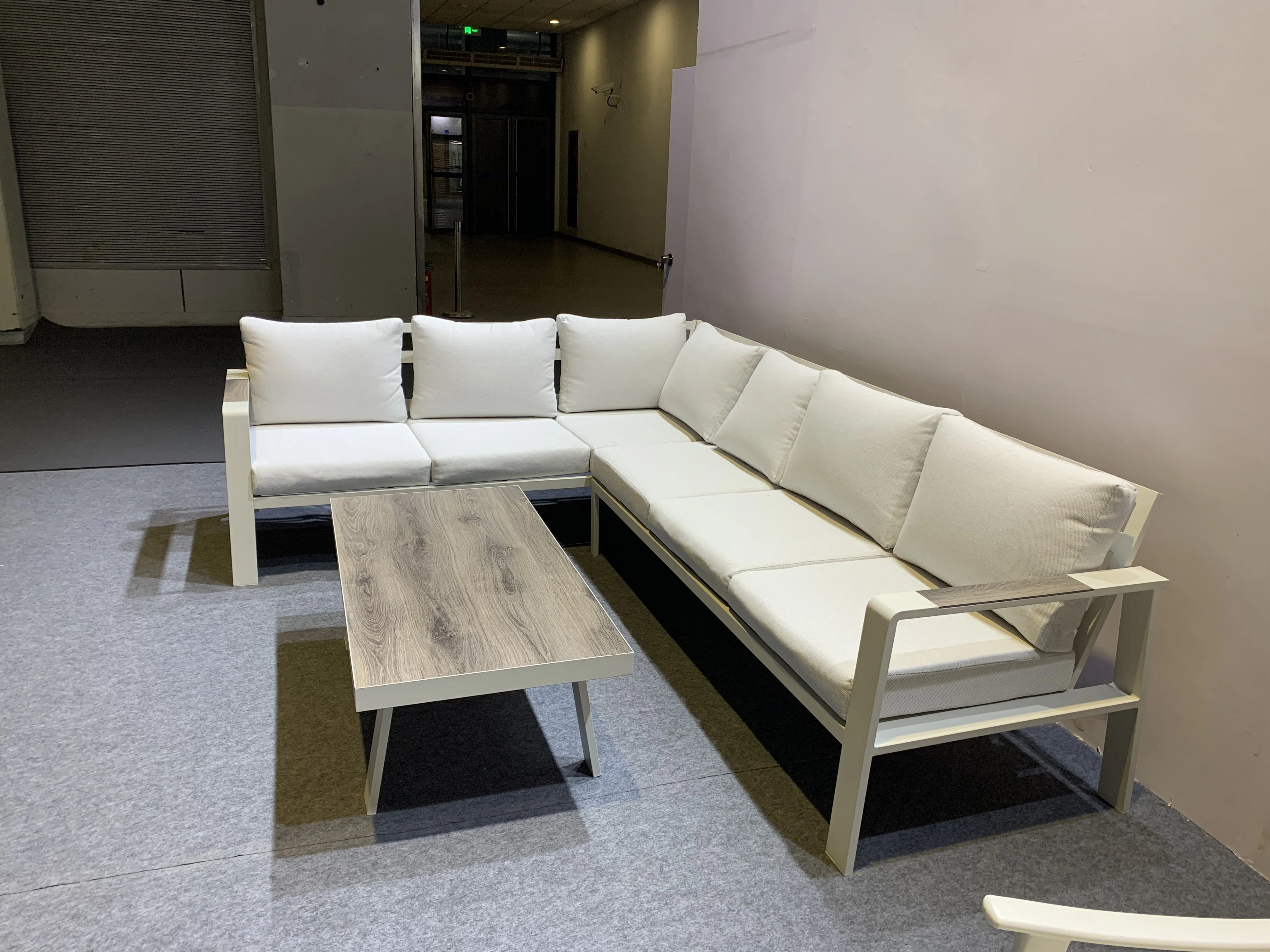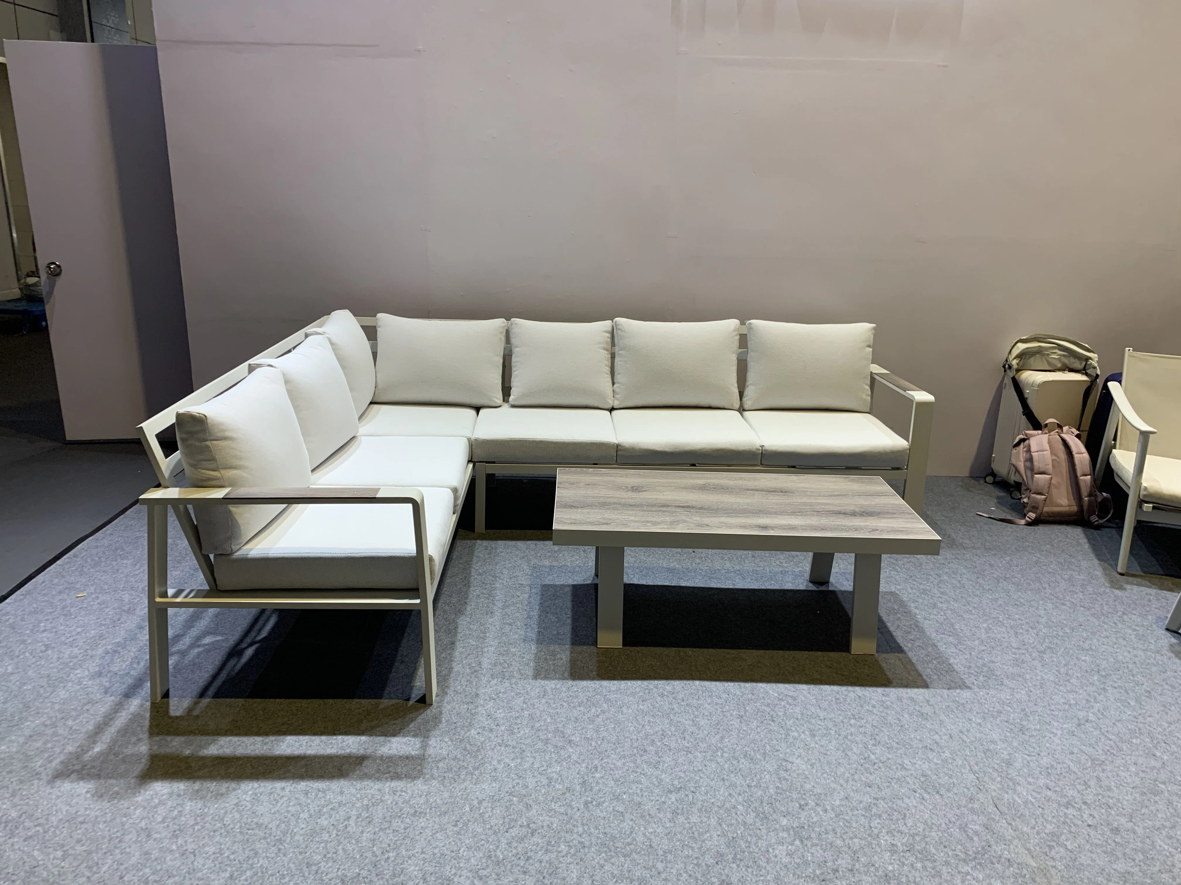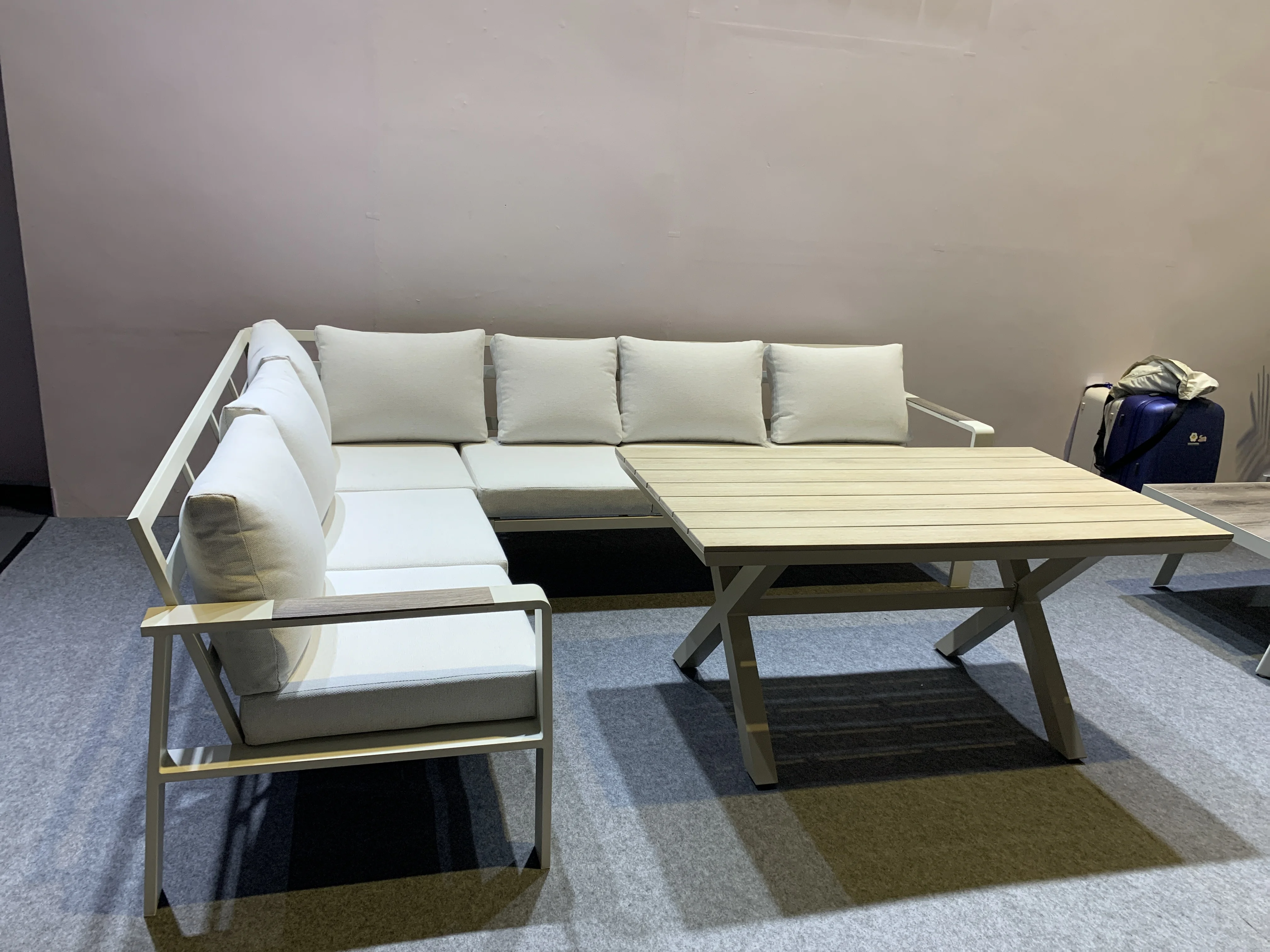 Увођење Алуминијумског угловног софе са светлим - Хјуед јастуцима и пластичним дрвеним столом, савршен додатак вашој спољној тераси за крајњи опуштај и удобност
